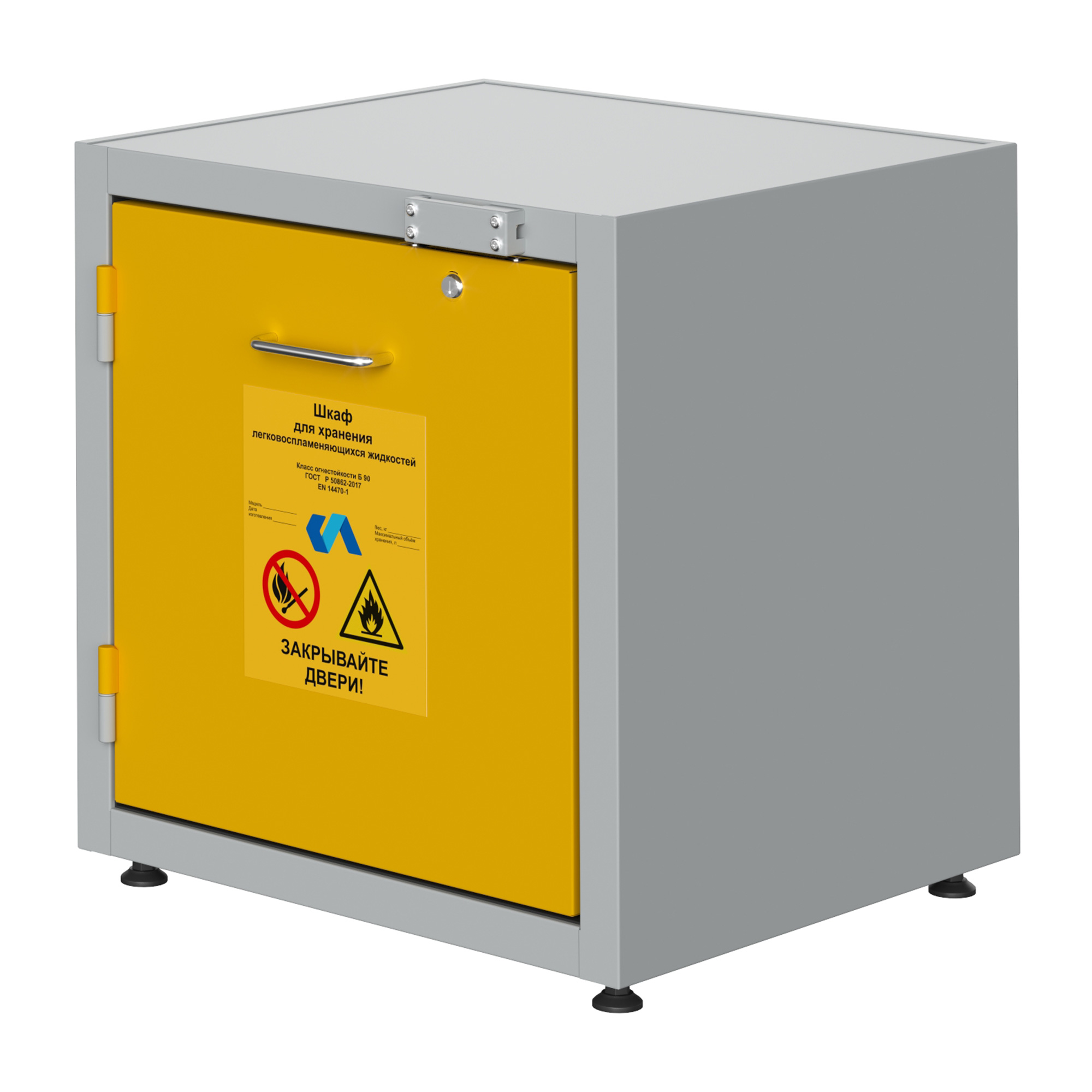 Испытания шкафа для хранения ЛВЖ на возгорание были произведены в аккредитованных лабораториях, в соответствии со стандартом ГОСТ Р 50862-2017. Шкаф изготовлен из стали толщиной 1,2 мм с и окрашен противокислотной порошковой эпоксидной краской, при температуре полимеризации 200° C. Толщина слоя краски составляет минимум 60 (микрон) и максимум 250 (микрон), в соответствии с требованиями ГОСТ 9-410-88 .Шкаф для хранения ЛВЖ обладает монолитной цельносварной конструкцией. Новая техника изготовления с двойной оболочкой, состоящей из двух корпусов, внутреннего и наружного. Новая огнеупорная изоляция, выполненная из экологически безопасного материала, характеризующегося высочайшей огнеупорностью. Внутренний корпус с панелями из не царапающегося материала, устойчивого к действию коррозийных веществ. Терморасширяющаяся прокладка 7 + 4 см, увеличивающаяся в объеме в случае пожара, полностью изолируя внутреннюю часть шкафа от внешней среды. Дополнительная терморасширяющаяся прокладка для защиты от пыли с защитой от “холодных и горячих дымов”. Распашные дверки, поддон для хранения из окрашенной эпоксидной порошковой краской электрооцинкованной стали, с противокислотной защитой, с решеткой, выполняющей роль полки. Объем сбора около 5 литров, грузоподъемность полки кг 80. Закрытие распашной двери шкафа для хранения лвж с автоматическим возвратом при каждом открытии. Система внутренней не форсированной вентиляции для паров, укомплектованная двумя предохранительными клапанами с автоматическим закрытием при температуре окружающей среды 70 ± 10° C, находящимися внизу и вверху, чтобы гарантировать автоматический выход наружу веществ, в соответствии с требованиями норматив. Наружный соединительный фланец для подключения к системе вытяжной вентиляции, диаметром 100 мм. Система предохранительного закрытия , автоматически срабатывающая и удерживающая дверь закрытой в случае пожара. Искробезопасные петли, расположенные по длине двери. Предохранительный цилиндровый замок, запирающийся на ключ. Плакаты, предупреждающие об опасности наличия возгораемых веществ и запрете курения, в соответствии с российскими и европейскими нормами безопасности. Клемма заземления на случай возникновения электростатического электричества. Регулируемые ножки для установки шкафа в горизонтальное положение. Руководство по эксплуатации и техобслуживанию.