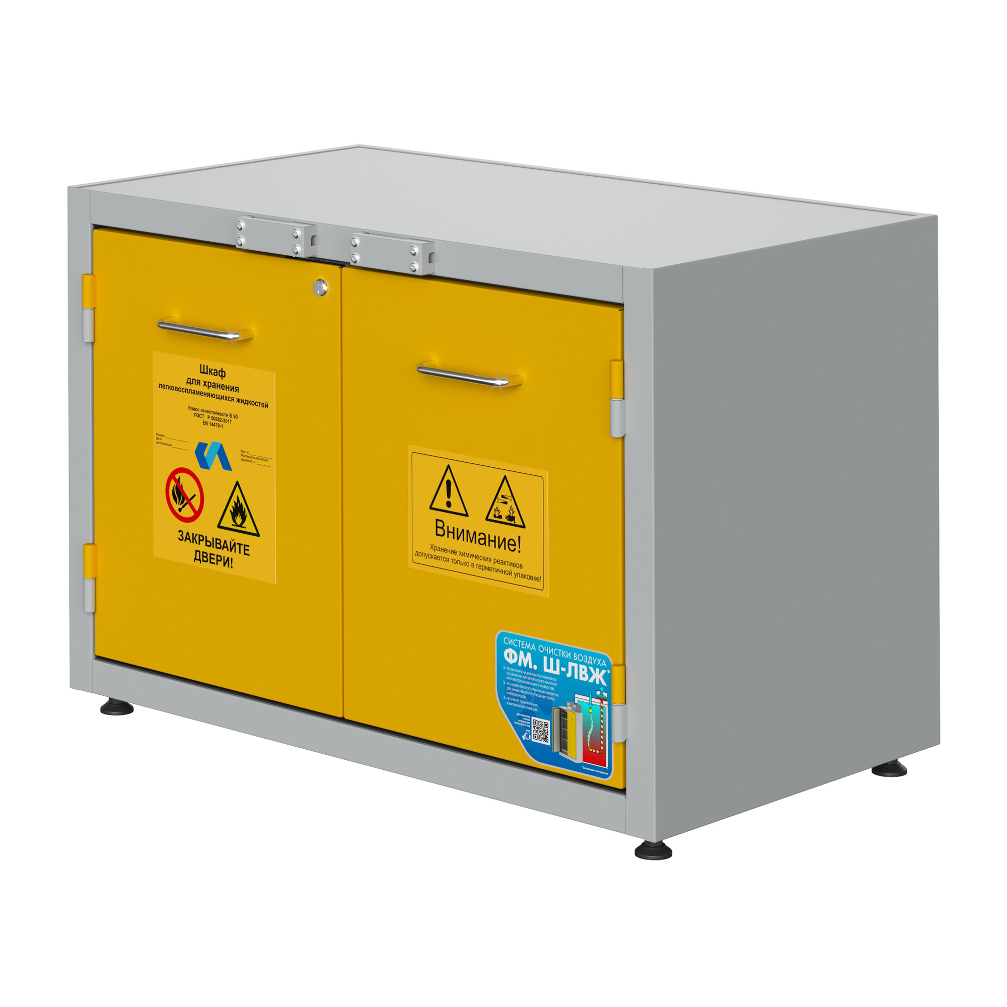Испытания шкафа для хранения ЛВЖ на возгорание были произведены в аккредитованных лабораториях, в соответствии со стандартом ГОСТ  Р 50862-2017. Шкаф изготовлен из стали толщиной 1,2 мм с и окрашен противокислотной порошковой эпоксидной краской,  при температуре полимеризации 200° C. Толщина слоя краски составляет минимум 60 (микрон) и максимум 250  (микрон), в соответствии с требованиями ГОСТ  9-410-88 .Шкаф для хранения ЛВЖ обладает монолитной цельносварной конструкцией. Новая техника изготовления с двойной оболочкой, состоящей из двух корпусов, внутреннего и наружного. Новая огнеупорная изоляция, выполненная из экологически безопасного материала, характеризующегося высочайшей огнеупорностью.  Внутренний корпус с панелями из не царапающегося материала, устойчивого к действию коррозийных веществ.  Терморасширяющаяся прокладка 7 + 4 см, увеличивающаяся в объеме в случае пожара, полностью изолируя внутреннюю часть шкафа от внешней среды. Дополнительная терморасширяющаяся прокладка для защиты от пыли с защитой от “холодных и горячих дымов”.  Распашные дверки, поддон для хранения  из окрашенной эпоксидной порошковой краской электрооцинкованной стали, с противокислотной защитой, с решеткой, выполняющей роль полки. Объем сбора около 5 литров, грузоподъемность полки кг 80.  Закрытие распашной двери шкафа для хранения лвж с автоматическим возвратом при каждом открытии. Система внутренней не форсированной вентиляции для паров, укомплектованная двумя предохранительными клапанами с автоматическим закрытием при температуре окружающей среды 70 ± 10° C, находящимися внизу и вверху, чтобы гарантировать автоматический выход наружу веществ, в соответствии с требованиями норматив. Наружный соединительный фланец для подключения к системе вытяжной вентиляции, диаметром 100 мм. Система предохранительного закрытия , автоматически срабатывающая и удерживающая дверь закрытой в случае пожара.  Искробезопасные петли, расположенные по длине двери.  Предохранительный цилиндровый замок, запирающийся на ключ. Плакаты, предупреждающие об опасности наличия возгораемых веществ и запрете курения, в соответствии с российскими и европейскими нормами безопасности.  Клемма заземления на случай возникновения электростатического электричества.   Регулируемые ножки для установки шкафа в горизонтальное положение.  Руководство по эксплуатации и техобслуживанию.