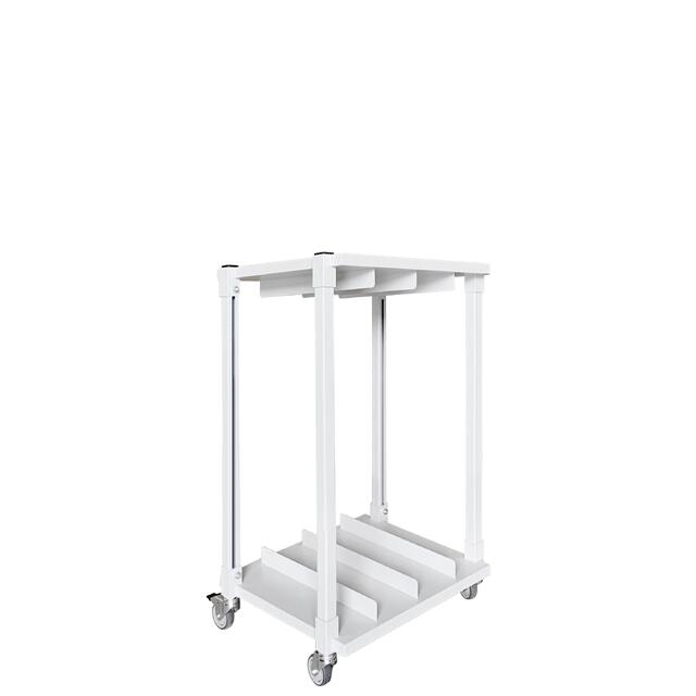 Cтойка СКМ используется для хранения и перемещения картонных заготовок, коробов. Полки имеют плавную, индивидуальную регулировку высоты и оборудованы перегородками для фиксации и разделения изделий. Верхняя полка имеет полость с резиновым покрытием для размещения вспомогательных, измерительных, канцелярских и иных принадлежностей. Стойка имеет четыре поворотных колеса (Ø 75 мм), два из которых оснащены тормозами. Каркас и полки выполнены из стали с эпоксидно-порошковым покрытием (Опционально RAL 7035). Максимальная нагрузка на стойку — 80 кг. Стойку для картонных коробок можно разместить рядом с рабочим столом, на складе или в зоне комплектации и упаковки.