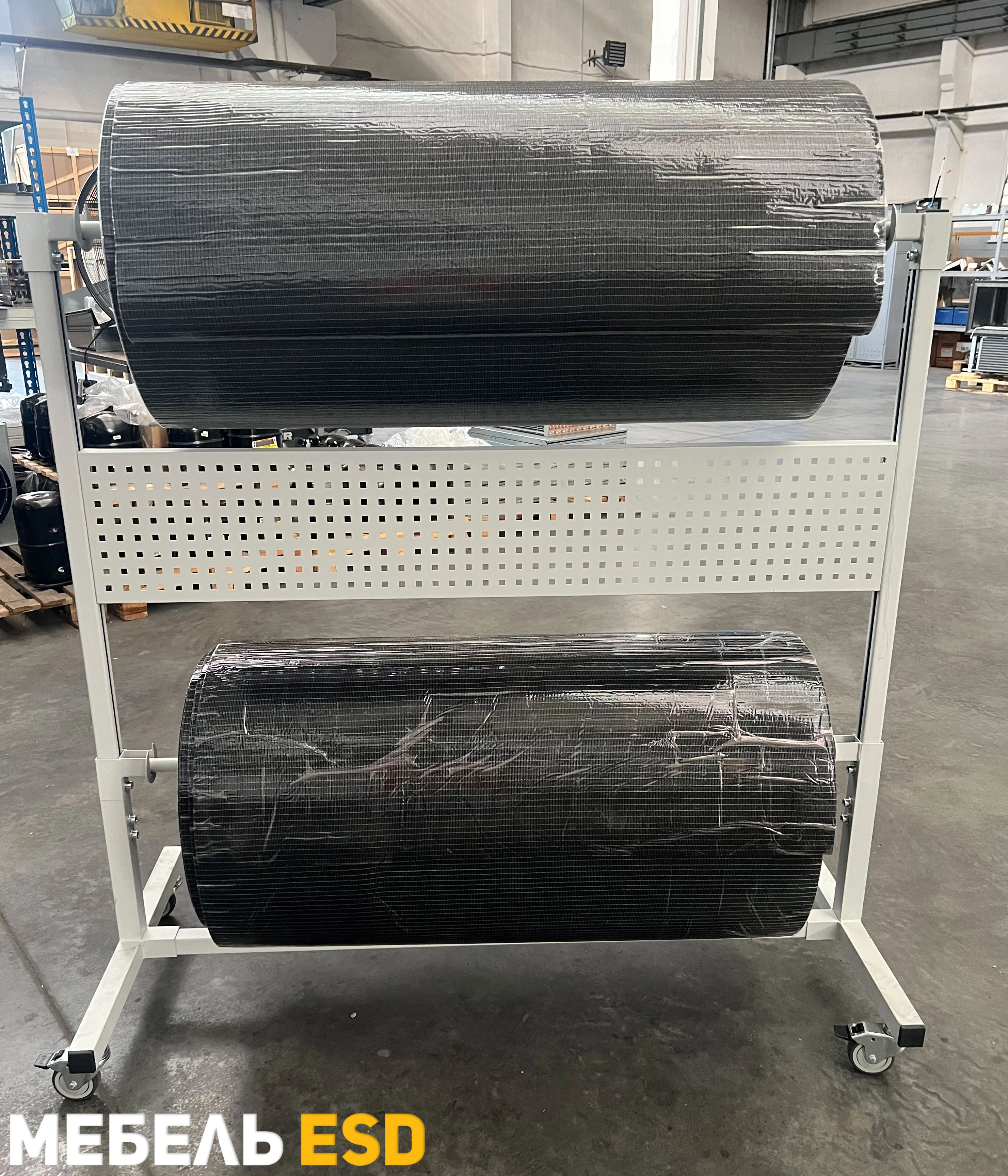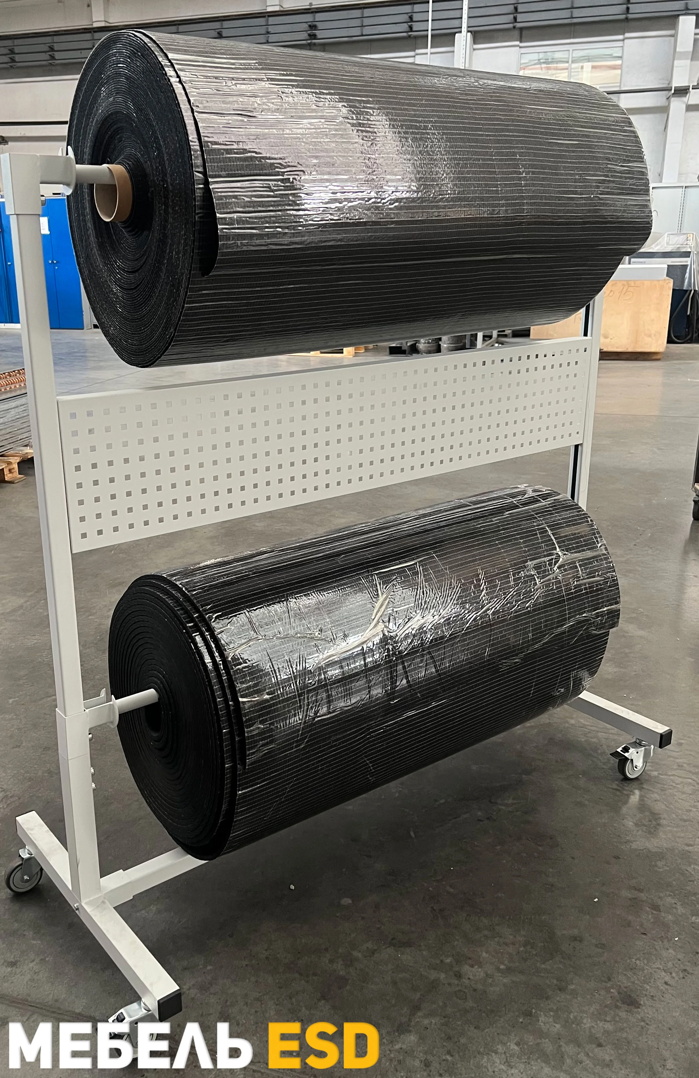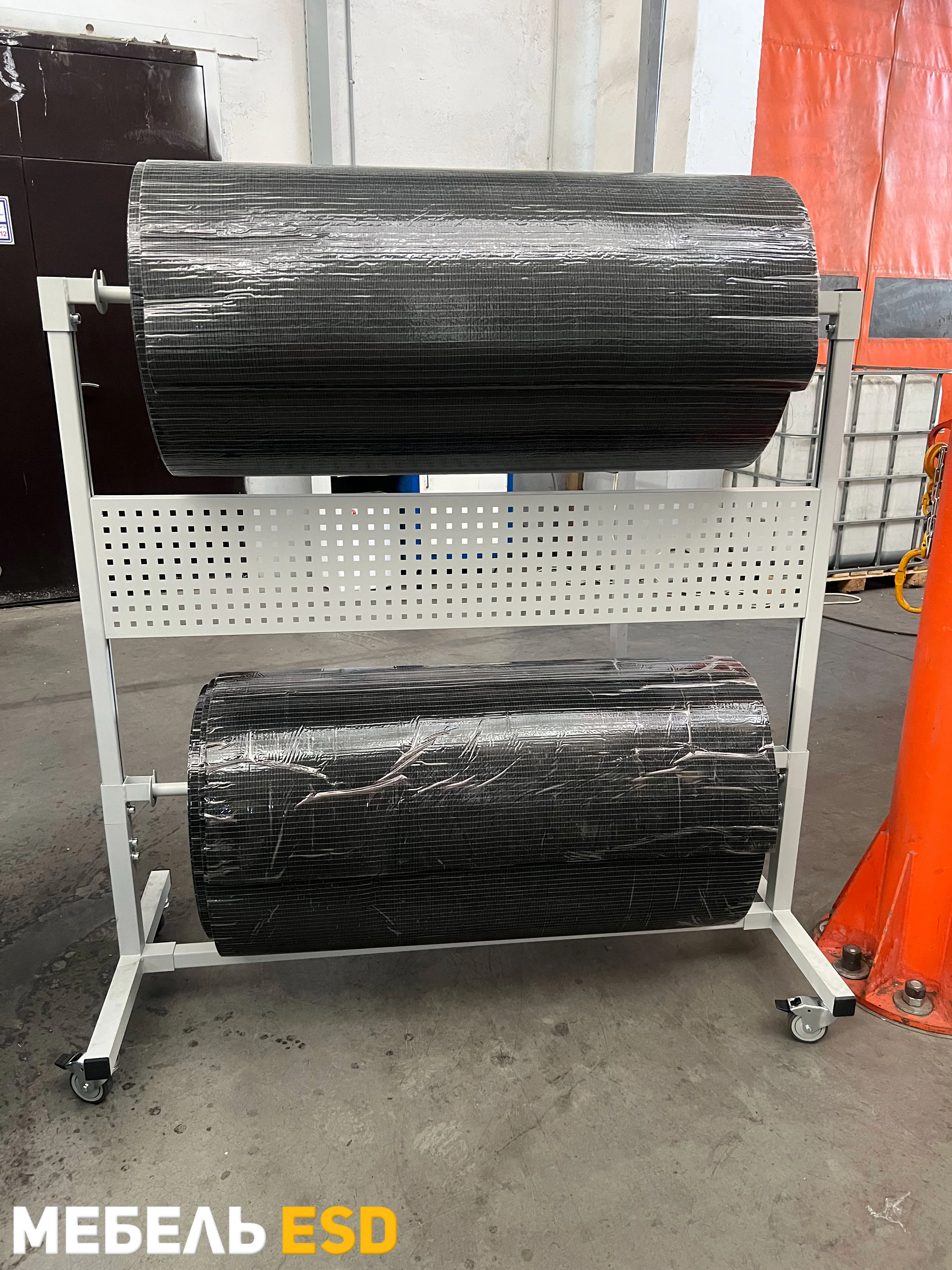 Стойка упаковочная для рулонов может быть использована для размещения и перемещения в рабочем пространстве рулонных материалов, таких как полиэтиленовая и воздушно-пузырчатая пленка, крафт бумага, а также рулонов с тканью. Стойка для рулонов изготовлена из металлического профиля шириной 35 мм и покрыта износостойкой порошковой краской RAL-7035. В стандартный комплект поставки входит: держатель для рулона — 1 шт., перфопанель — 1 шт.