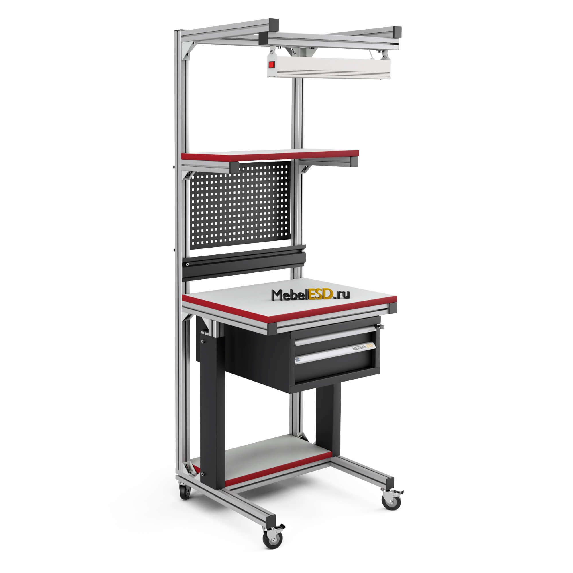 Стойка подкатная ремонтная из конструкционного профиля СР-КП является мобильным рабочим местом с возможностью перемещения оборудования и принадлежностей в рабочей зоне. Стойка оснащена: перфопанелью, инструментальной полкой с возможностью регулировки по высоте, нижней полкой, планкой для крепления лотков, подвесной металлической тумбой на 2 ящика, комплектом освещения светодиодным КОС-КП, четырьмя колесными опорами, две из которых с механизмом фиксации. Высота стойки — 1950 мм, ширина — 700 мм, глубина — 550 мм.