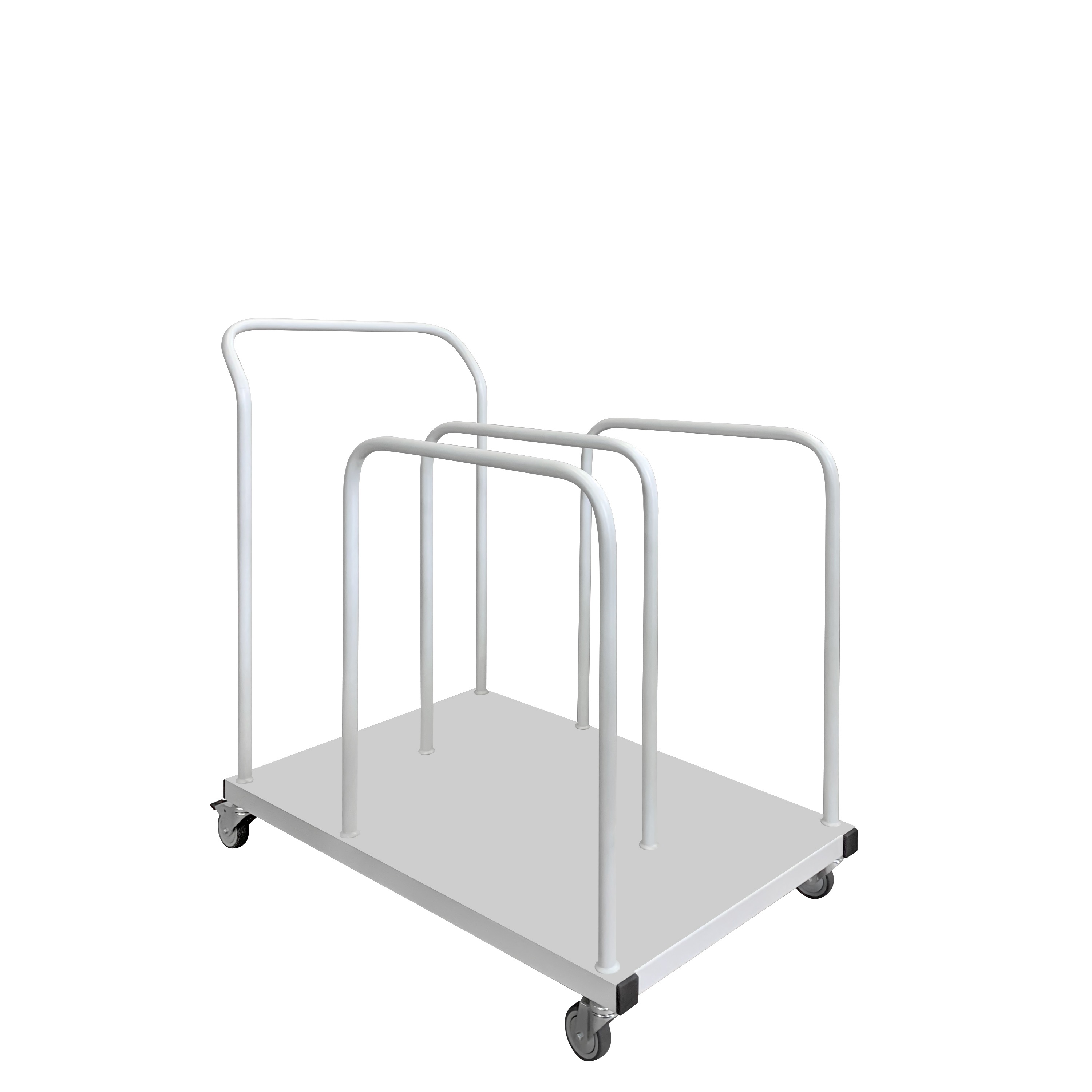 Тележка для картона ТМК предназначена для хранения и транспортировки в рабочем пространстве листового картона и картонных коробок. Тележка состоит из трех секций, выполненных из стальной трубы, что позволяет выдерживать даже самые большие упаковочные коробки. Тележка имеет прочную стальную раму, четыре поворотных колеса, два из которых снабжены тормозами.